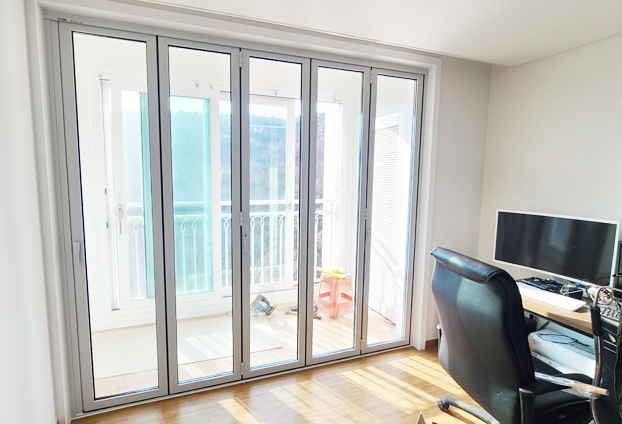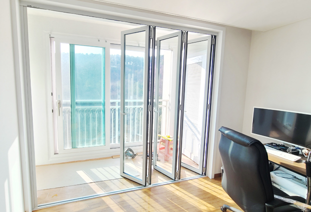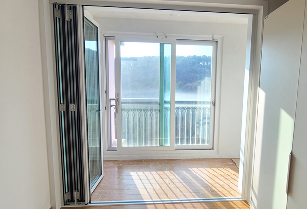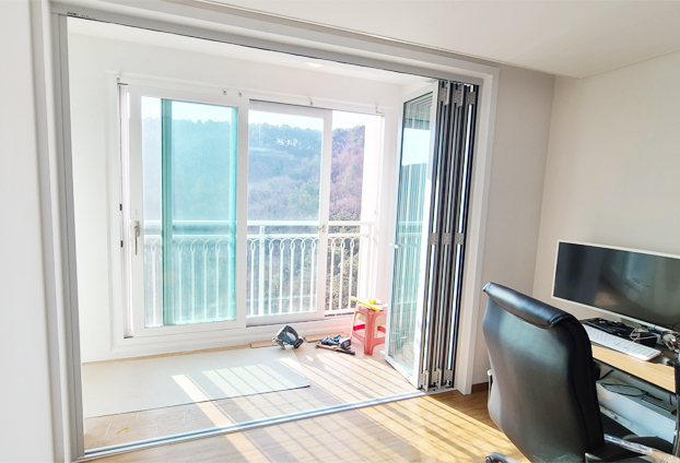 거실과 베란다 중문으로 폴딩도어를 설치하고 통베란다로 연결된 작은 방에도 폴딩도어를 설치하여 더욱 베란다 공간을 유용하게 활용할수 있도록 하였습니다.