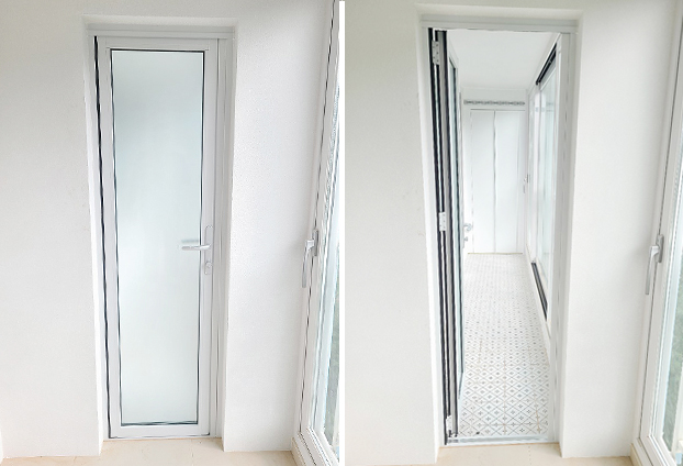 베란다 한쪽공간과 다용도실에는 모티스락 손잡이가 장착된 경첩도어를 설치하였으며, 반투명인 미스트유리로 제작하여 다소 복잡한 다용도실의 내부 모습을 차단하여 깔끔하게 보일수 있도록 하였습니다.