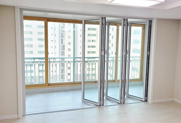 폴딩도어를 오픈하였을때 베란다 확장시공을 한 공간확장감을 주었으며, 90% 이상의 개폐율로 폴딩도어를 접어놓았을때도 이질감이 없습니다.