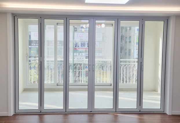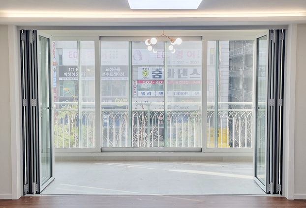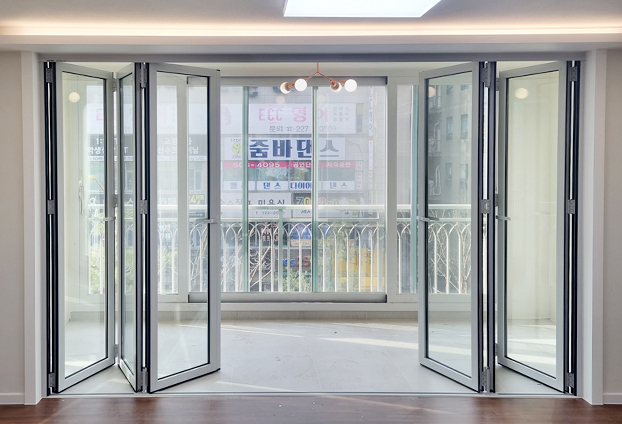 베란다와 거실 중문으로 가장 큰 선호도를 보이는 폴딩도어로 가장 큰 장점은 90% 이상의 큰 개폐율을 보유하여 확장된 공간과 분리된 공간을 자유롭게 조절할 수 있다는 점이라고 생각 됩니다.