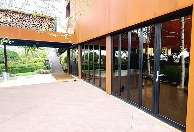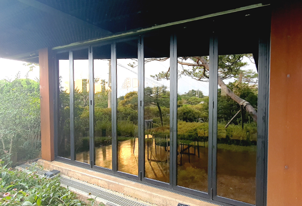오렌지색상의 건물 컨셉과 우드의 분위기와 잘 어울리는 블랙색상의 폴딩도어와 브론즈 색상의 유리를 선택하여 시공을 진행하였습니다. 블랙과 브론즈의 색상의 유리로써 카페의 분위기와도 너무나 잘 어울어져 멋지고 세련된 외관으로 업그레이드 되었습니다.