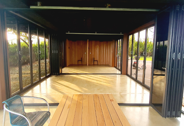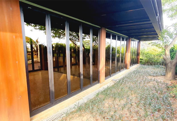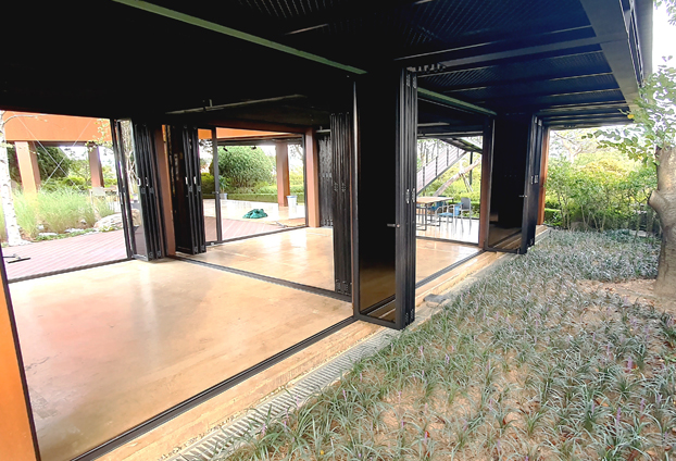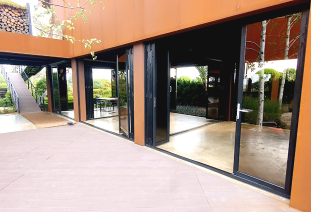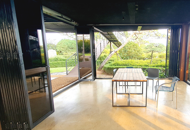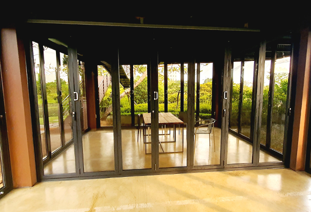 폴딩도어를 설치함에 날씨와 상황에 따라 개방과 밀폐를 하여 공간 활용도를 높였습니다. 또한 폴딩도어를 모두 펼쳐 공간을 분리 하였을시 더운 편리하게 출입할수 있도록 모티스락 손잡이를 장착하여 별도의 출입문도 같이 설치를 진행하였습니다. 또한 폴딩도어의 렉기어 손잡이만으로도 충분히 여닫이가 가능하지만, 더욱 손쉬고 빠른 구동을 위해 보조 손잡이를 추가로 장착하여 제작하였습니다.