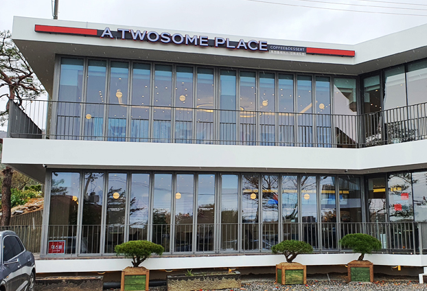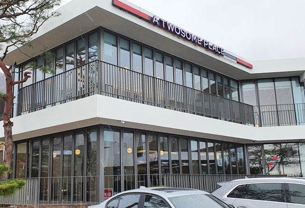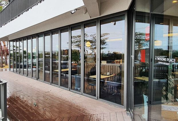 많은 분들이 방문하시는 투썸플레이스 입니다. 1~2층 외벽 모두 폴딩도어를 설치하여 확트인 시야감으로 전망 좋은 위치에 자리 잡은 카페 장점을 크게 부각 시켰습니다. 밝은 외벽 색감과 블랙 색상을 포인트로 컨셉을 잡아 건축된 카페건물로 블랙 색상의 폴딩도어를 설치 하였습니다.