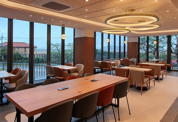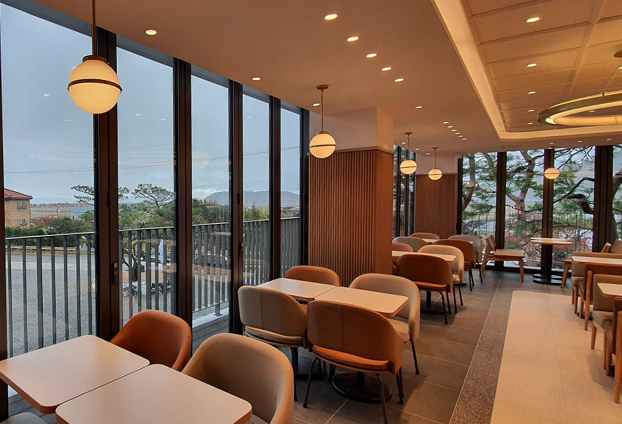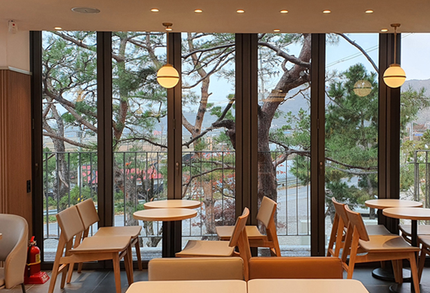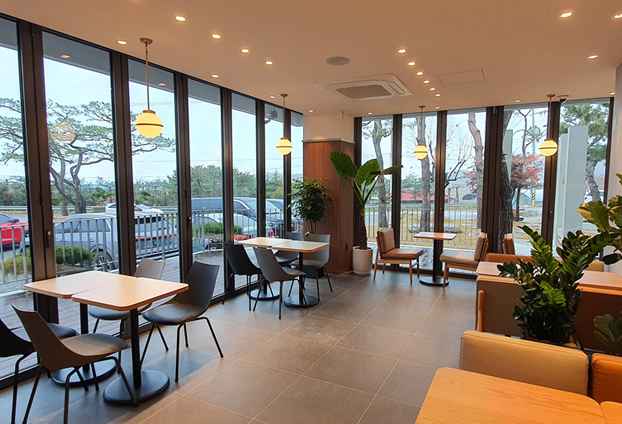 폴딩도어의 90% 이상의 개폐율로 모두 개방하면 매장에 방문하신 손님에게 외부의 좋은 날씨가 매장 내부까지 전달되어 야외 같은 분위기로 탁트인 공간에서 맛있는 수제 양갱 등과 함께 향긋한 커피와 차를 음미하며 지인들과 함께 즐거운 시간을 보낼 수 있습니다.