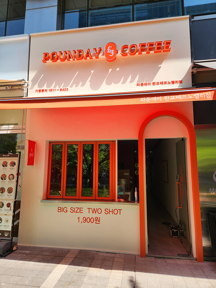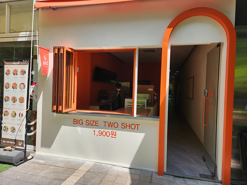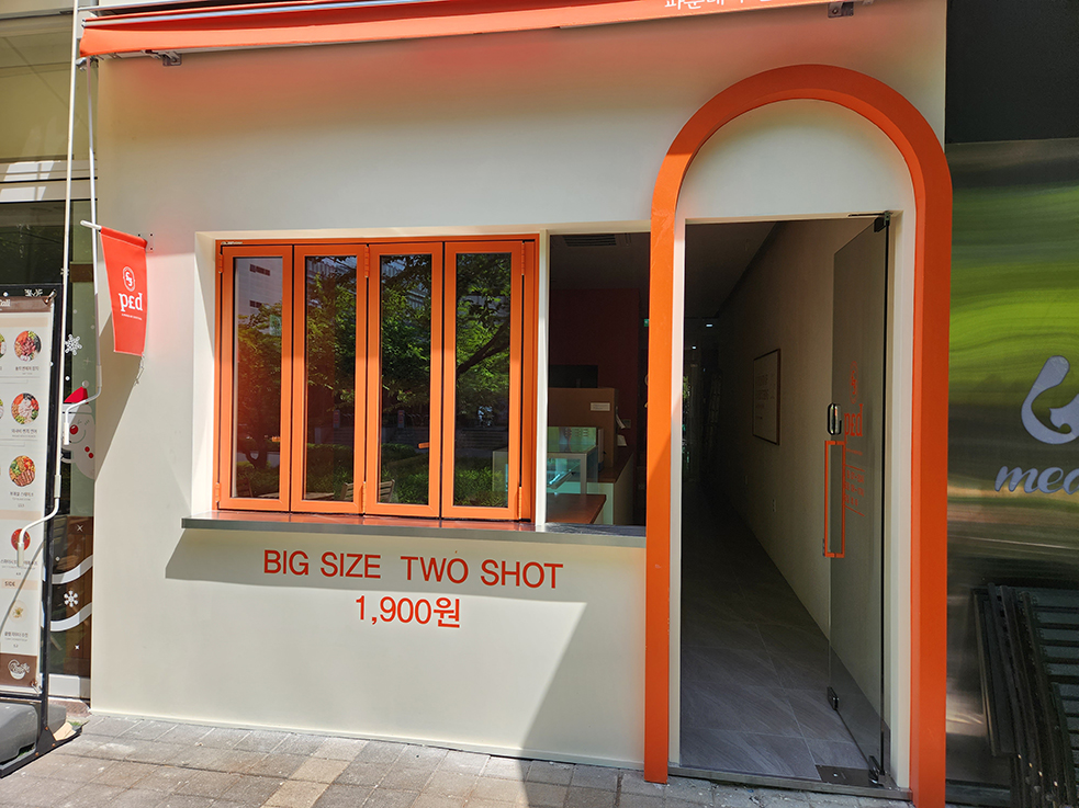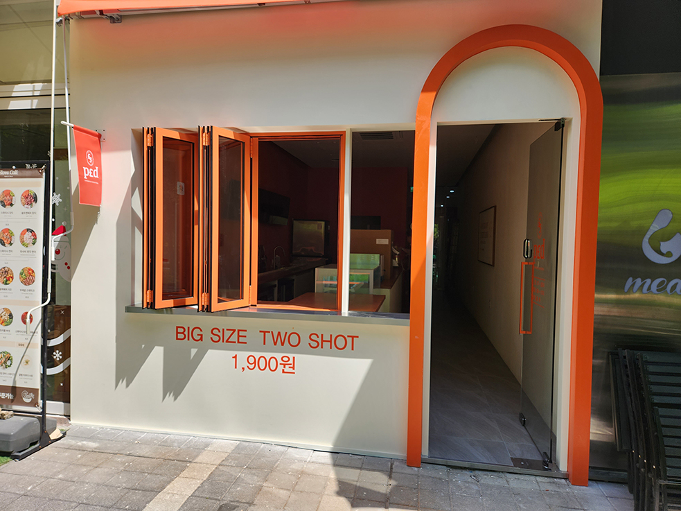 프랜차이즈 대표 컬러인 오렌지색 컬러를 지정색으로 제작하여 외관의 인테리어를 특별히 하진 않았지만 오렌지색 폴딩도어가 포인트가 되면서 상큼한 느낌이 듭니다.