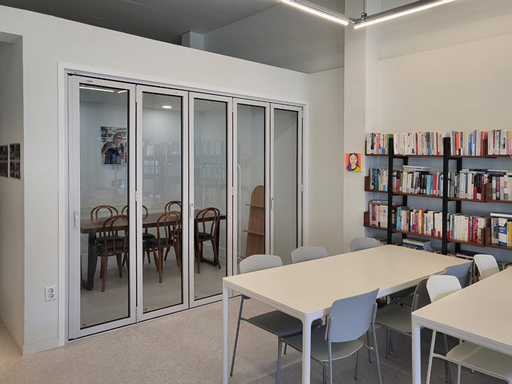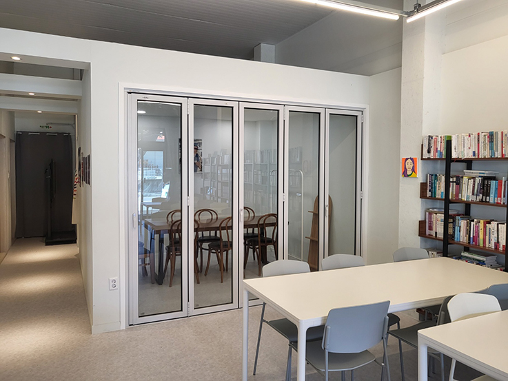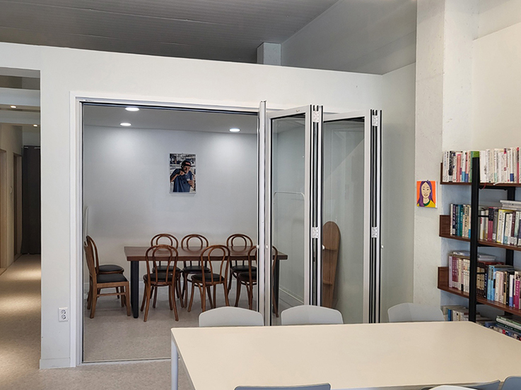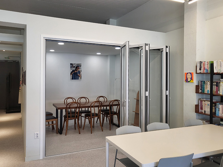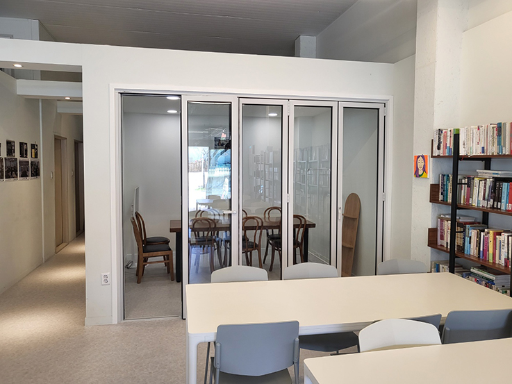 북카페 형태의 카페에서 책을 읽으며 커피를 마실 수 있는 조용한 공간입니다. 단체 모임 손님을 위한 룸 공간을 추가하고, 그 공간에 폴딩도어를 설치한 점이 매우 실용적이고 창의적입니다. 좁은 공간에서 다른 도어를 설치하거나 가벽을 만들기 어려운 상황에서 폴딩도어는 개별 공간을 효과적으로 분리할 수 있게 해주고, 동시에 공간이 좁아 보이지 않게 해줘서 인테리어 효과도 높여줍니다.