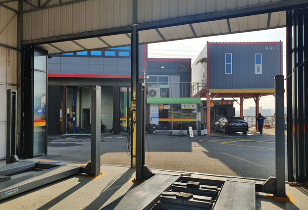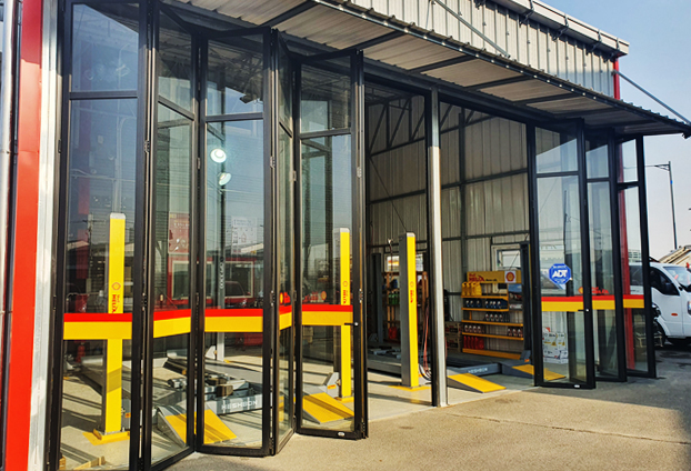 오일과 다양한 오염물들이 많은 카센터 특성에 맞게 블랙 색상의 폴딩도어로 제작을 진행하였으며, 보다 넓은 개폐감을 주기위해 각 프레임 마다 한방향으로 개폐 하는 편개형 전개방식으로 시공을 진행하였습니다. 크기가 큰 차량이 출입해야하는 카센터로 넓은 출입구가 필요한데 그런 이유로 상시 뻥 뚫린 출입구만으로 둔다면 각각 진행되는 작업 소리에 내부 뿐만 아니라 외부까지 시끄러운 소음 소리가 퍼져 인근 주민분들 등에게 피해를 전달 하게 됩니다.