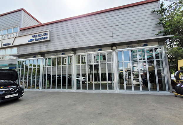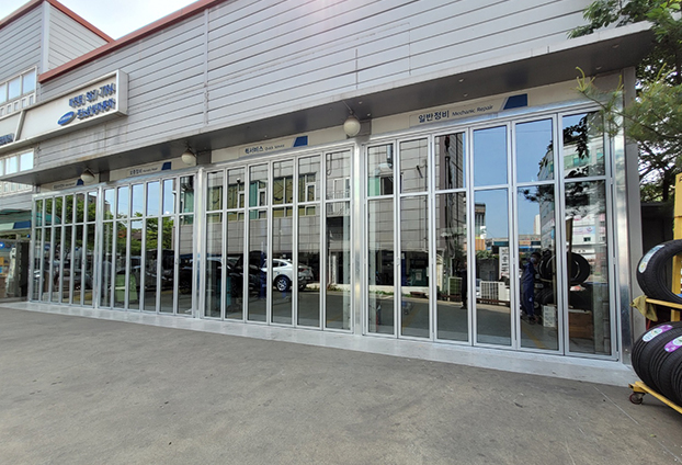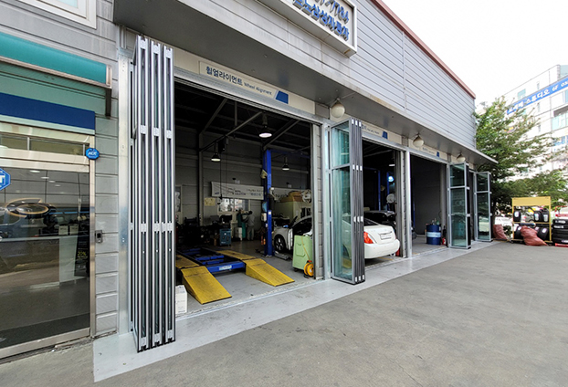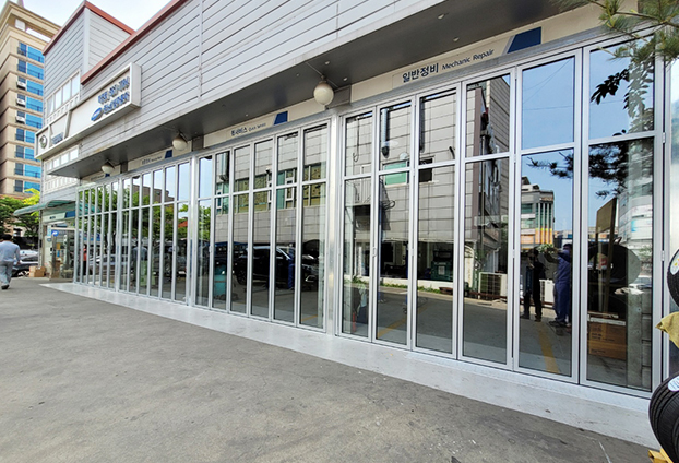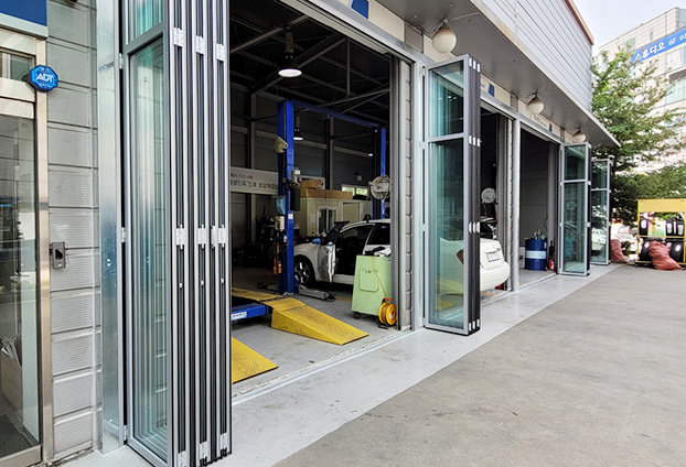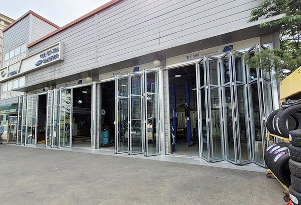 카센터, 정비소, 타이어센터 등과 같이 자동차가 많이 출입하는 곳에는 폴딩도어 하부레일은 카센터 전용 하부레일로 시공을 진행해야합니다.