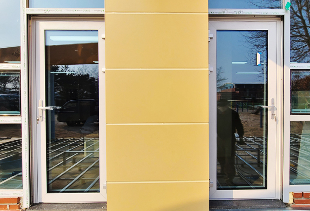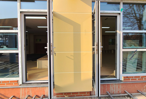 학교외부와 다목적교실이 연결된 출입문 경첩도어 입니다. 외부와 연결된 점에서 더욱 편리하게 다목적교실을 출입할 수 있게 되었습니다. 경첩도어 측면에 고무가스켓으로 마감처리를 하여 밀폐성과 기밀성이 높아 외부와의 차단 효과가 좋습니다.