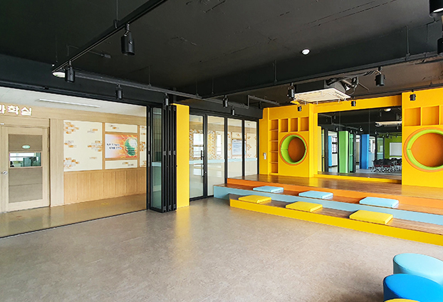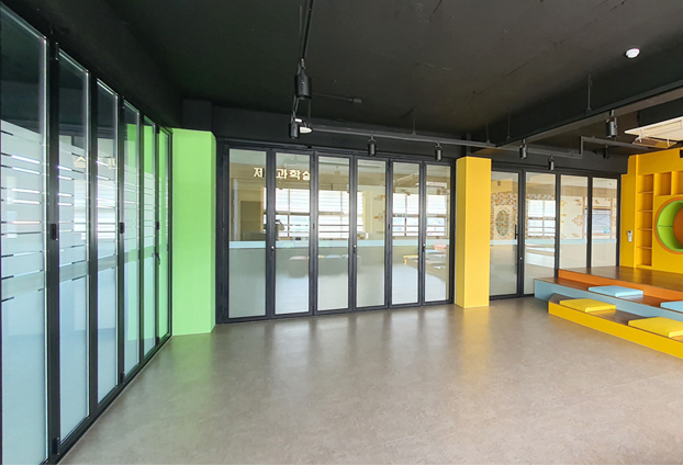 각각의 콘셉트와 테마로 이루어진 초등학교 다목적실 공간에 폴딩도어를 설치하였습니다.