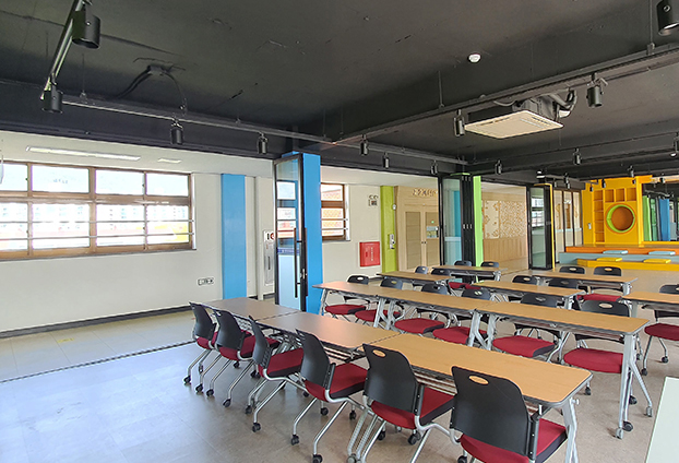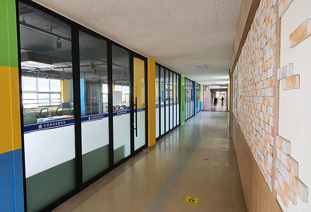 공간을 나누어 교실별로 수업을 진행하기에 반투명 시트지를 후가공하여 수업 진행에 방해가 되지 않도록 하였습니다.