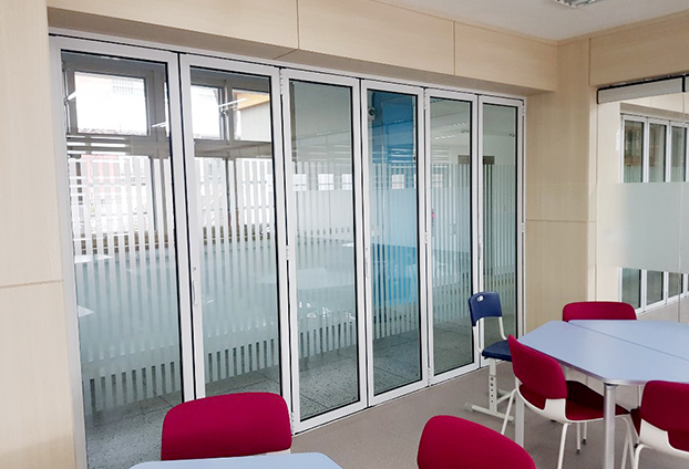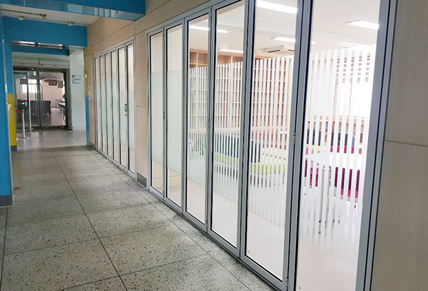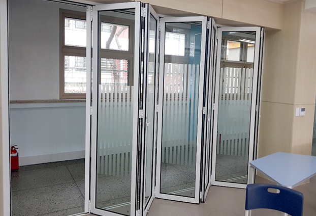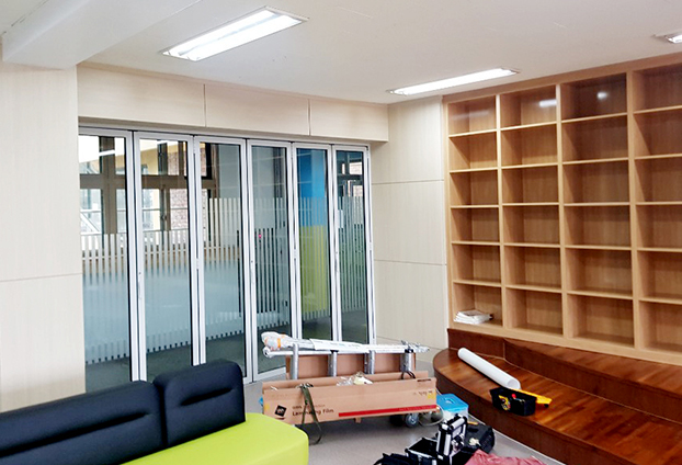 방음의 효과도 좋은 폴딩도어로써 수업을 할때에는 복도와 분리가 확실하여 수업에 집중도를 높힐 수 있습니다. 하부레일을 통해 가볍고, 부드럽게 여닫이가 가능하여, 어느 누구도 손쉽게 여닫을수 있으며, 바닥매립레일이 아닌 바닥 위에 바로 시공하여 사용하는 슬림형으로 시공하였습니다. 그럼에도 바닥위에 많이 올라오지 않기에 개폐시에도 불편함 없이 출입이 가능합니다.