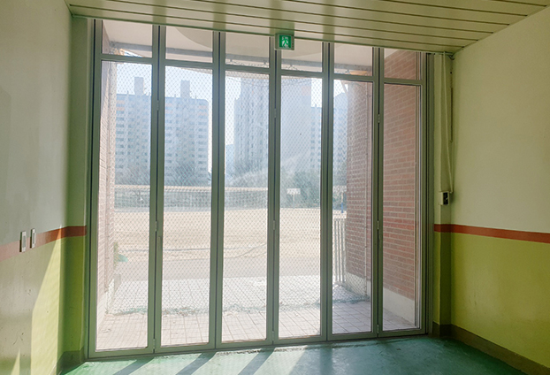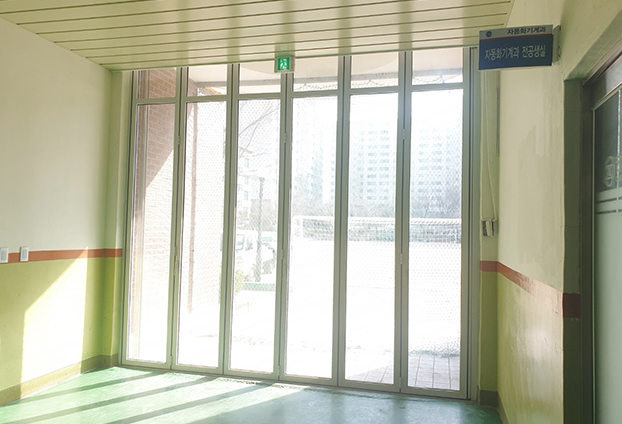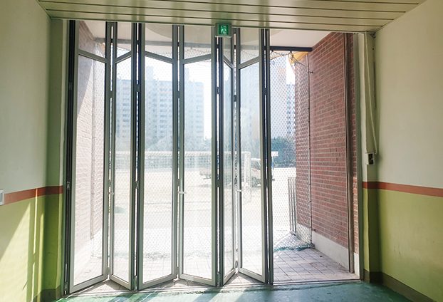 개방감 90%를 자랑하는 폴딩도어로써 많은 학생들이 함께 빠르게 통행이 가능합니다. 이전 불투명인 철문이 설치 되어 있을때는 햇빛도 차단되며, 공기도 잘 통하지 않았습니다. 철문의 소재 특성상 딱딱해보이며, 심지어 차가워보이는 철문으로 삭막한 학교의 분위기를 형성 하였습니다.