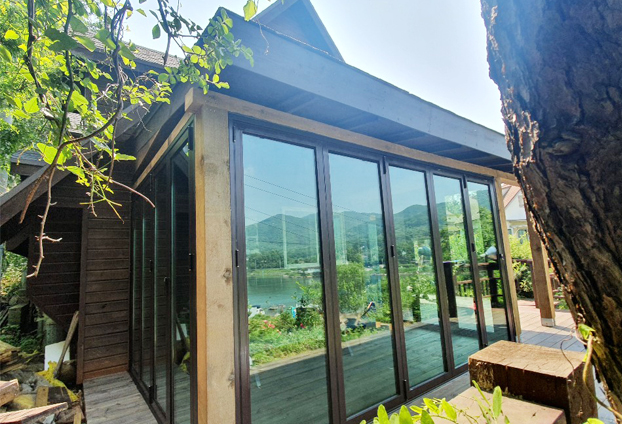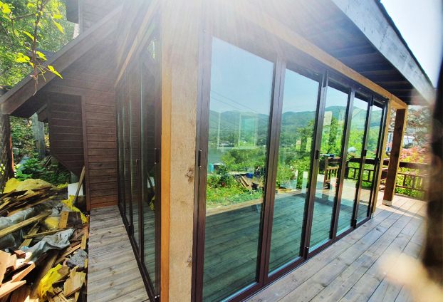 원목 소재로 지어진 펜션으로 더욱 잘 어울리는 초코색상의 프레임과 유리는 그린+그린 색상으로 선택하여, 더욱 자연속에 있는 듯한 느낌으로 설치하였습니다.