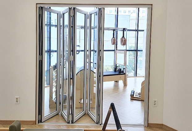 칸막이 겸 폴딩도어를 설치하면 공간을 탄력적으로 운영할 수 있기 때문에 운동하는 희원분들과 강사진들 모두 순조로운 수업을 진행 할 수 있습니다. 폴딩도어 모두 개방하여도 프레임이 넓지 않기 때문에 많은 자리를 차지하지 않습니다.