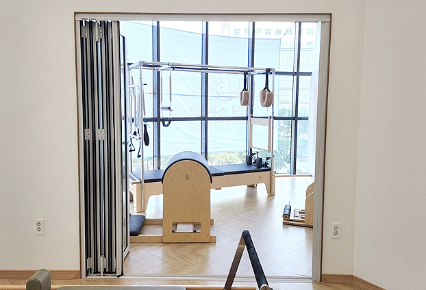 다양한 기구로 운동하는 수업 방식이 다른 필라테스 센터 입니다. 공간을 2개로 나누어 수업과 회원들을 관리하며 칸막이 폴딩도어 설치하였습니다.