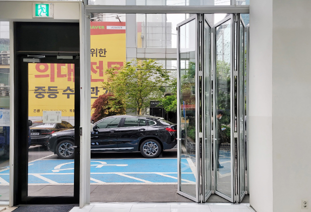 자동차를 직접 전시해야 하는 공간이다 보니 개폐가 넓은 출입구를 보유해야 합니다. 그리하여 BMW전시장에 카센터형 폴딩도어를 설치하고 왔습니다.