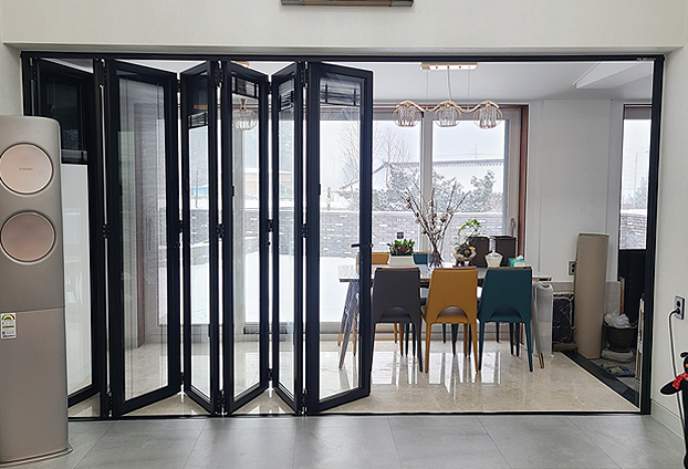 개인 단독주택으로 1층에 위치한 실내 공간이 외부에서 유리창을 통해 노출이 될 수 있는 점에 프라이빗한 공간으로 블라인드가 포함된 폴딩도어를 설치 하였습니다.