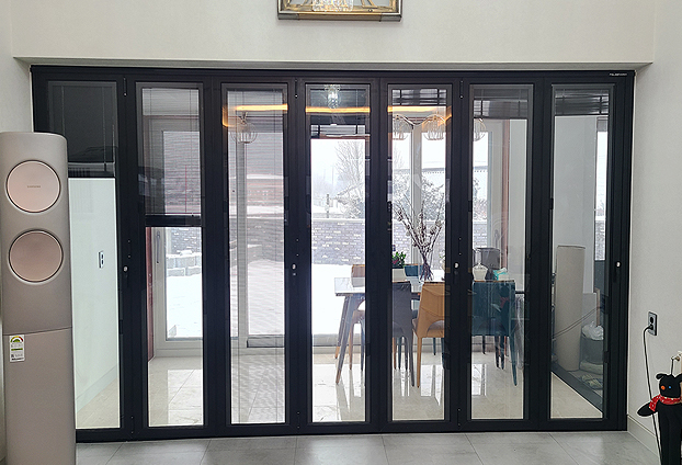폴딩도어 복층 유리창 내부에 들어가 있는 블라인드로써 바람등에 영향을 받지 않아 깔끔함을 유지할 수 있습니다. 폴딩도어와 함께 블라인드 길이와 위치 등을 개별적으로 조절이 가능하기에 원하는 만큼 개방이 가능하기에 개방감을 조절할 수 있습니다.