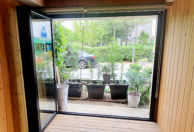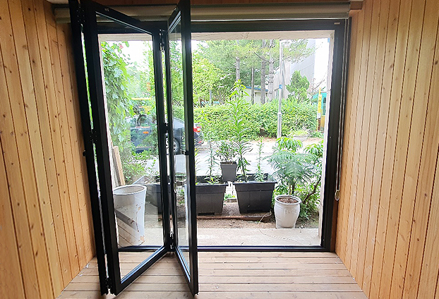 주택 외부에 큰 화분 등으로 화초를 가꾸는 것이 취미 생활이신 거주자님께서는 출입문이 더욱 필요하셨습니다. 그리하여 90%이상의 개폐률을 보이는 접이식인 폴딩도어를 여닫으며 미서기창보다 큰 출입공간이 되었습니다.