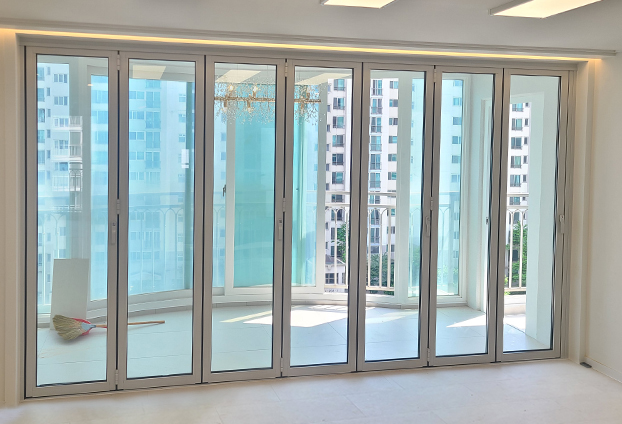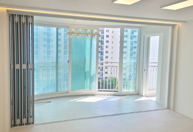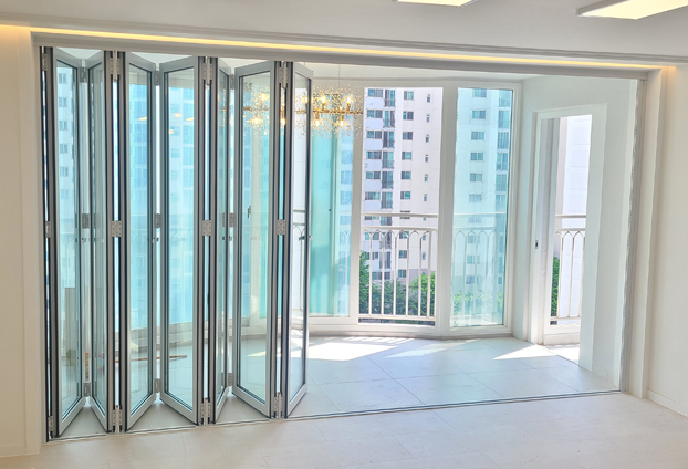 거의 대부분의 아파트 베란다와 거실 중문으로 위의 이미지와 같은 미서기 창을 사용중 입니다. 미서기창은 고정된 픽스창과 미닫이 창 1~2창으로 시공된 창입니다. 하지만 고정된 픽스창으로 인해 1~2개의 미닫이 창을 열어도 출입 공간은 제한적인 공간으로 개폐율이 큰 폴딩도어 보다 공간 활용도가 떨어질 수 밖에 없습니다.