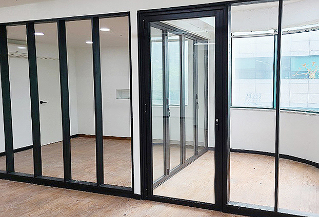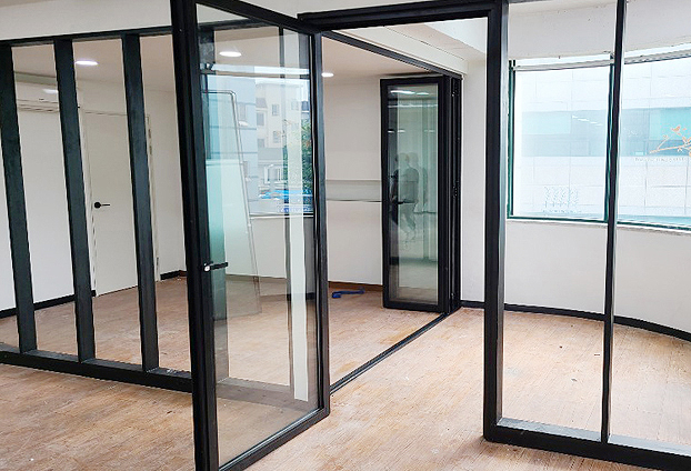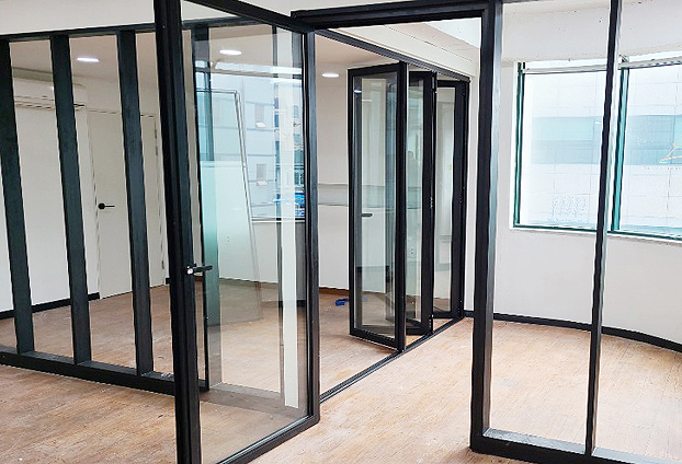 넓은 사무실 한 부분에 폴딩도어와 픽스창을 설치하여 넓은 개폐율로 공간을 확장하고 분리하여 공간활용도를 높였습니다. 고정되어 개폐가 되지 않는 창인 픽스창으로 가벽을 세우고 그 안쪽에 폴딩도어를 설치하여, 한공간을 두공간으로 또는 한공간으로 공간 다양성을 주었습니다.