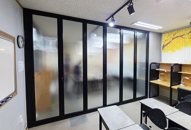 공부를 하는 공간이기 때문에 방음효과가 가장 중요합니다. 폴딩도어는 개폐도 부드럽고 손쉽게 편리하지만 방음효과도 뛰어나기에 이처럼 학생들이 조용하고 안전하게 공부 할 수 있도록 세밀하게 시공을 진행하여 설치합니다.