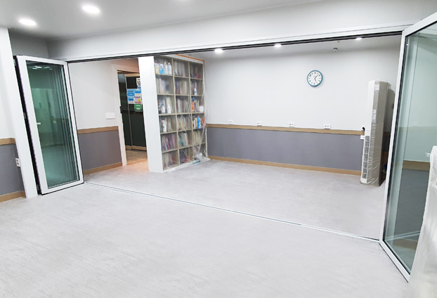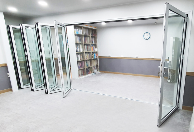 폴딩도어의 여러 많은 특징 중 학원, 학교 등에 폴딩도어를 설치하는 이유는 공간 활용도를 높이기 위함이 큽니다. 도어를 닫아 넓은 공간을 분리하여 사용하기도 하며, 도어를 접어 한공간으로 확장하여 사용도 가능합니다. 실내 공간을 분할 해 사용할수 있는 공간 효율성에 우수한 폴딩도어 입니다.