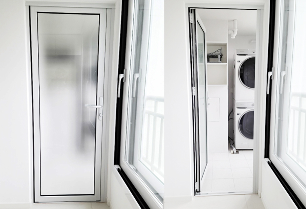다용도실에는 미스크 유리를 넣은 힌지도어를 시공하였으며, 반투명 효과를 보여주는 미스크유리를 통해 프라이빗한 느낌으로 훤히 드려다 보이지 않지만, 완전히 불투명하지 않기 때문에 답답함이 덜합니다.