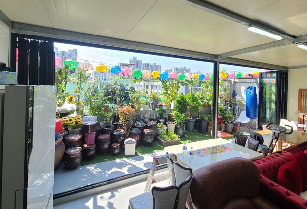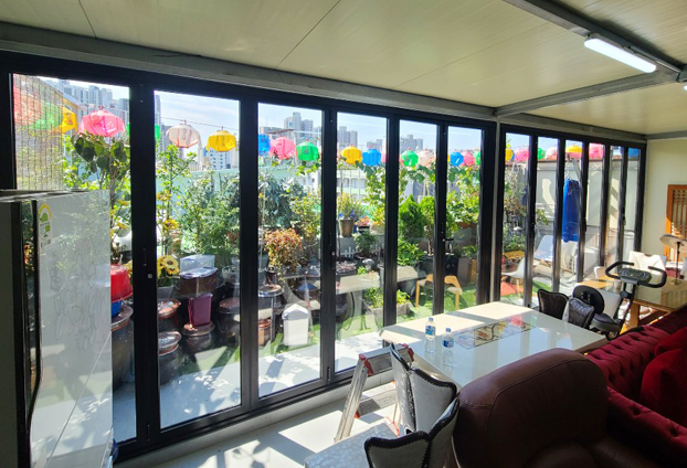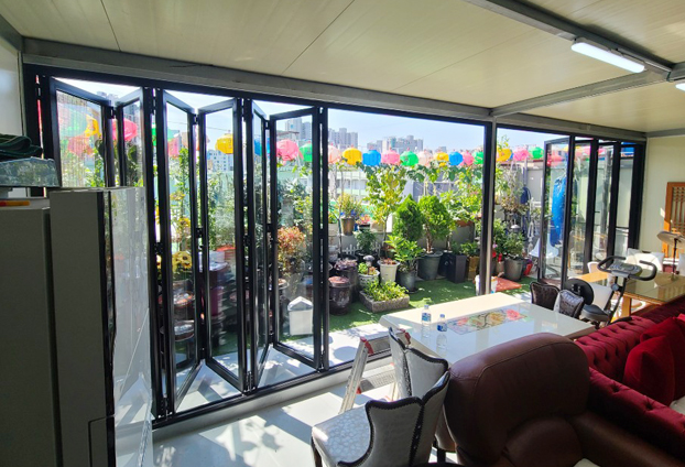 야외 옥상정원과 휴식공간에 폴딩도어를 설치하여, 가벽 및 출입문으로 사용합니다. 날씨가 좋은 날에는 역시나 개폐율 좋은 폴딩도어를 활짝 열어 외부와 내부의 공기 순환으로 쾌적한 환경이 유지를 할수 있으며, 넓은 개방감으로 야외정원까지 한 공간으로 멋진 정원을 감상하거나 가꿀수 있습니다. 또한 폴딩도어를 모두 닫아 야외정원을 분리하여 비가 오거나 바람이 많이 부는 날씨가 궂은 날에는 공간 분리를 하여 휴식공간인 실내에서 야외정원도 바라보며 휴식을 취할수 있습니다.