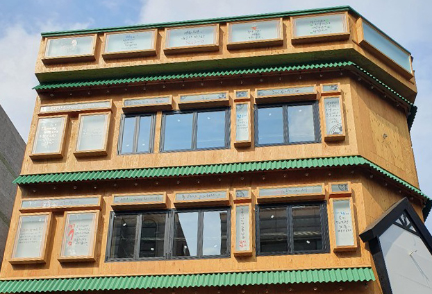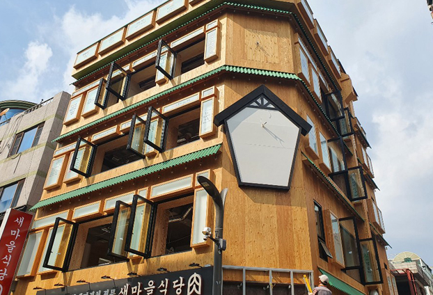 상가 2~4층까지 생기는 규모가 큰 호프집 창문을 모두 폴딩도어로 시공 하였습니다. 외부에 설치되는 창문형 폴딩도어는 날씨에 변화에 외부의 기온과 비 등이 실내로 유입되지 않도록 하부레일을 일반 폴딩도어 하부레일과 다르게 설계하여 외부격납방식으로 제작합니다.