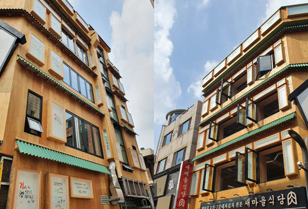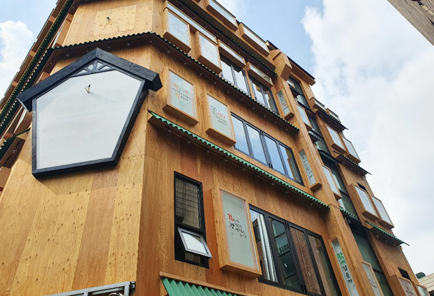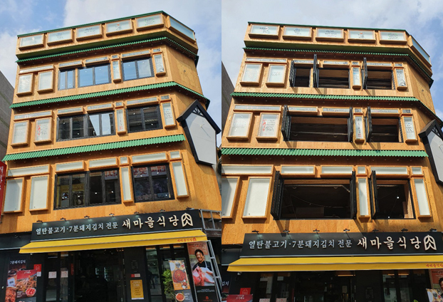 독특한 외관의 상가로써 폴딩도어 시공까지 완료 하니 더욱 멋진 상가로 완성 된 느낌입니다. 화려한 모습의 상가 모습에 이질감 느끼지 않도록 블랙 색상의 프레임으로 진행하였으며 양쪽으로 여닫을수 있는 양개형 전개방식으로 시공을 진행하였습니다.