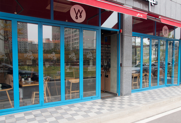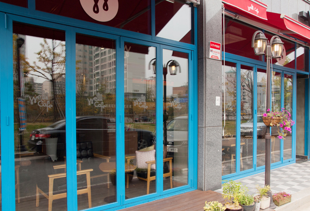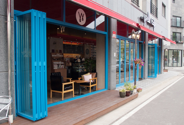 실외에서나 실내에서나 통 유리창보다 인테리어 효과를 더욱 많이 주는 폴딩도어로 지나가는 손님들의 눈길을 사로잡을수 있습니다. 전체적인 인테리어 컨셉과 색상에 맞게 지정색인 파란색으로 시공을 진행하였습니다. 매장 전면 모두 폴딩도어로 시공을 하여 막힌 곳 없이 시원한 인테리어로 마무리 하였습니다.