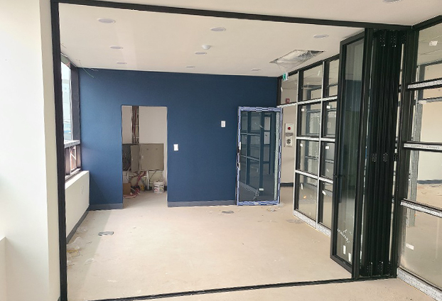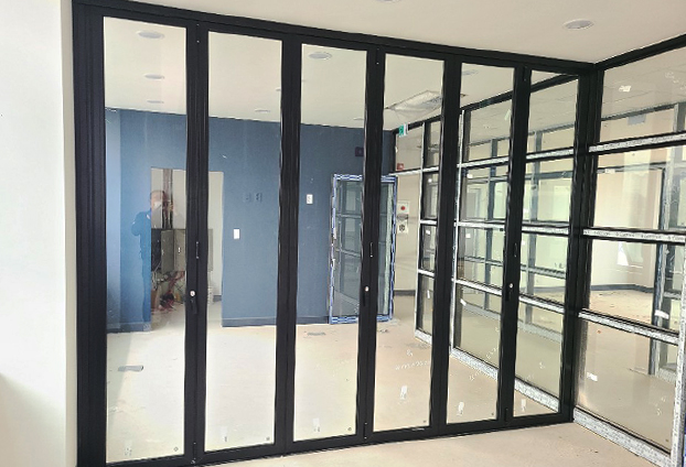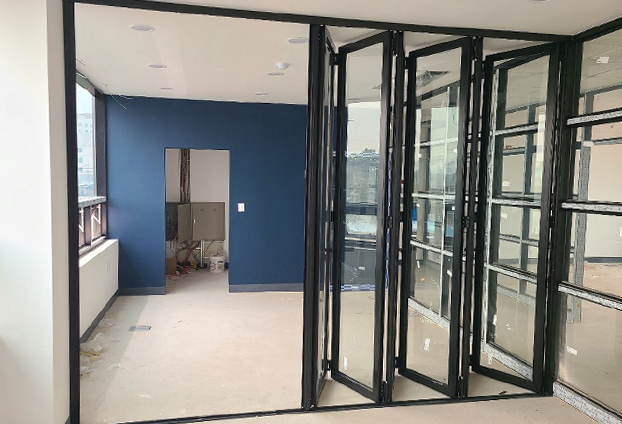 많은 부서가 있는 사무실 안에서 부서별 또는 각 목적에 맞게 사용할수 있는 공간으로 샷시를 이용해 각각의 공간을 구분하는 공사중 입니다. 구분하는 공간 중에서도 공간 확장과 구분이 필요한곳에 불투명한 칸막이로 답답하게 공간을 구부하기보다는 유리창이 들어가 전체적으로 밝아보이며 넓은 시야감까지 주는 폴딩도어로 칸막이 겸 출입문으로 시공하였습니다.