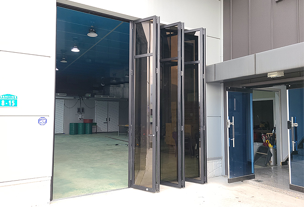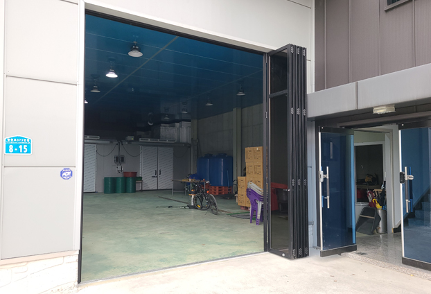 공장 특성상 무거운 자재, 자동차 등 무게가 많이 나가는 것들이 공장 내에 들어갔다 나왔다를 자주 하기에 이번 신축공장 폴딩도어 하부레일은 무거운 무게에도 견뎌내는카센터형 하부레일로 진행하였습니다. 일반형 하부레일과 다르게 날개형 설계로 무거운 무게를 분산하여, 통행시 하부레일이 받는 충격을 줄였으며, 통행시 걸리는 턱이 없어 불편함없이 부드러운 주행이 가능합니다.