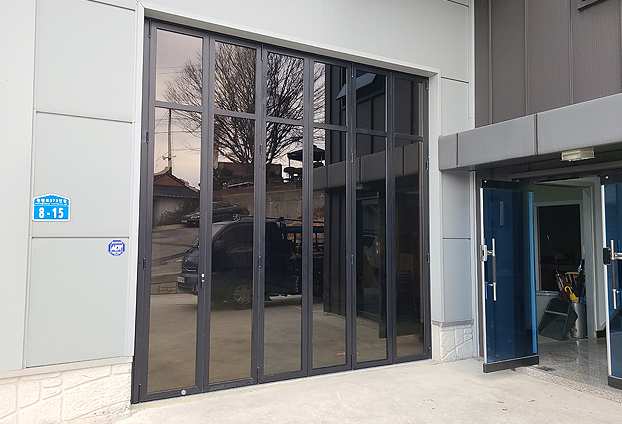 총 6짝의 도어와 생활오염에 강한 블랙색상으로외부에 설치됨에 맞게 단열 프레임으로 시공을 진행하였습니다. 차량통행시 한번에 여닫기 편하도록 편개형 구동방식과 유리는 기본 16T 투명 복층유리로 시공하였습니다.
