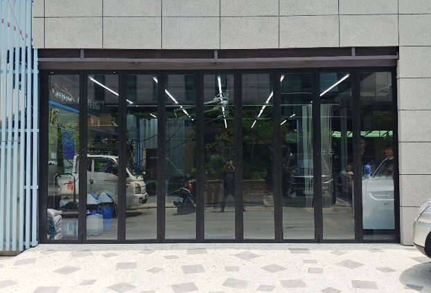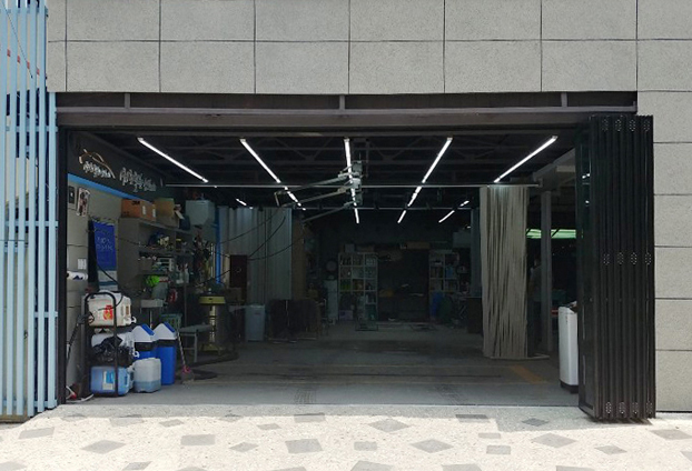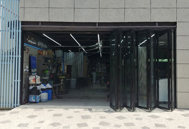크기가 큰 차량들이 출입을 해야하는 매장 특성상 그만큼 넓은 출입문이 넓고, 개방감과 확장감도 넓고 커야합니다. 카센터와 정비소 같은 매장에서는 넓은 출입문을 사용해야하기에 폴딩도어 이전에는 위에서 아래로 열고 닫는 셔터문을 설치하여 사용하곤 하였습니다.