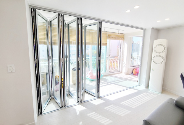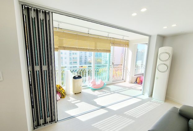 90% 이상의 개폐율를 자랑하는 폴딩도어로 필요에 맞게 여닫아 공간활용도를 높게 합니다. 샷시 틀 위에 하부레일을 끼워 시공을 하였어도, 하부레일이 더 높아지는 것이 아니라 기존 그대로의 틀 높이를 유지하여 통행에 불편함을 주지 않습니다. 넓은 확장감에 넓은 거실의 공간도 생기지만 빠른 공기 순환으로 쾌적한 실내공기를 유지할수 있습니다.