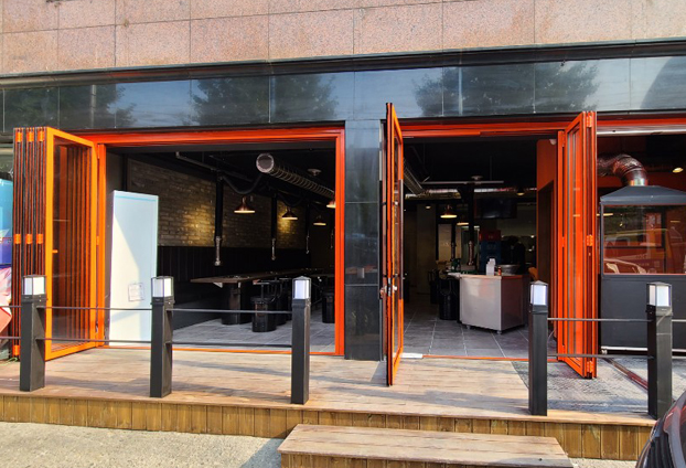 이제는 상점에 폴딩도어는 필수라고 할 정도로 많은 음식점, 카페 등 요식업에서 전면 폴딩도어를 설치하여 사용 중 이십니다. 많은 음식점에서 폴딩도어 선호도가 높은것은 그 만큼 많은 장점과 함께 인테리어적인 효과도 상당하기 때문입니다. 또한 공간 활용성이 더욱 다양해지기에 전면 전체를 시공하여 사용을 하십니다.