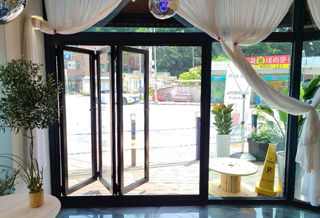 여러 사람이 함께 사용하는 곳으로 입구가 좁으면 통행도 어렵고, 손님에게도 불편함을 줄수 있는데, 폴딩도어를 활짝 열어 테라스의 활용도와 사용도를 높이고, 통행도 수월해집니다. 부드러운 구동과 반자동 구동으로 여닫을때 걸리는 부분 없이 큰 힘 들이지 않고 여닫을수 있으며, 문 사이사이마다 고무가스켓 마감처리로 손끼임사고에 부상도 방지 하였습니다. 단열과 방음, 방품에도 큰 효과를 보이기에, 여름철 더운 기온과 겨울철 추운 기온도 단열 효과가 높아 에너지 소비를 절감 시켜줍니다.