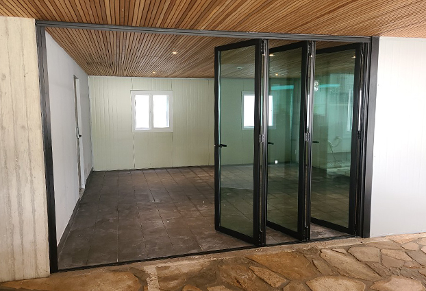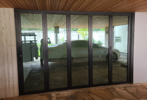 초코색상의 프레임과 24t 그린+투명의 복층유리로 총 5개의 폴딩도어를 편개형 구동방식으로 시공을 하였습니다.