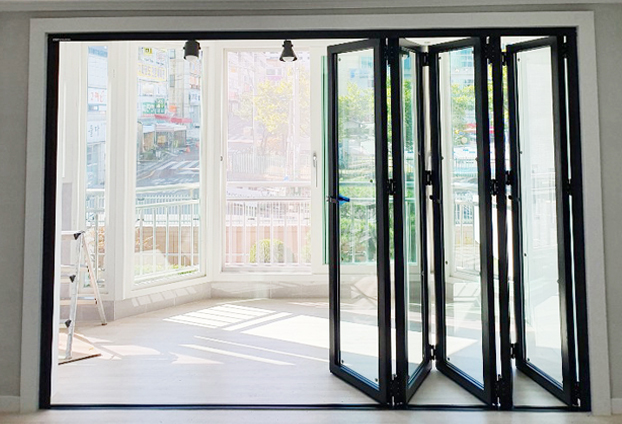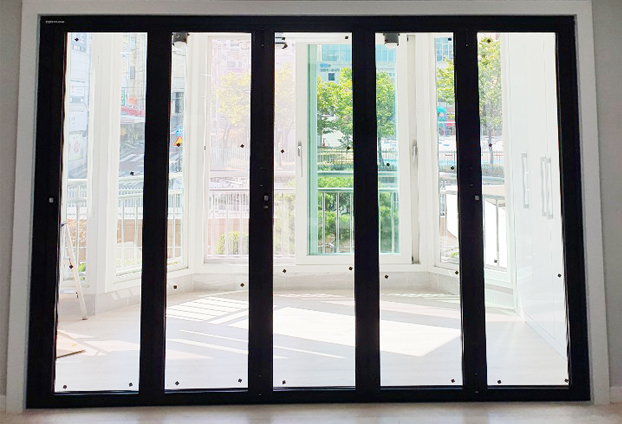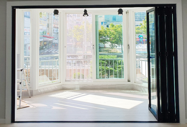이번 아파트(주거지) 베란다는 일반 베란다 일자형 구조와 다른 특이한 육각형의 구조로 되어있어 독특하며 더욱 넓은 베란다의 공간으로 설계된 아파트 입니다.이러한 멋진구조에 폴딩도어까지 함께 인테리어 된다면 너무나 멋지고 세련된 공간으로 더욱 업그레이드 됩니다. 총 5개의 문짝으로 양개형 구동방식으로 시공을 진행하였습니다.