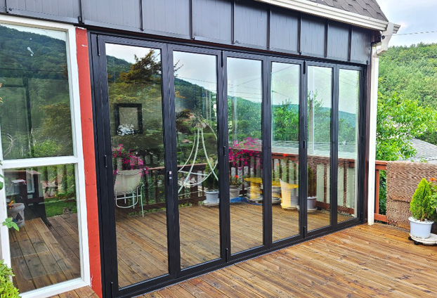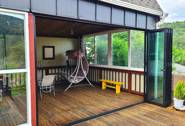 개인 전원주택 2층에 한쪽 공간에 폴딩도어를 설치하여 테라스 공간까지 확장 또는 분리 목적으로 사용할 계획입니다. 90% 이상의 개방으로 실내에서 생길수 있는 먼지와 탁한 공기를 빠르게 환기가 가능하며, 쾌적한 실내환경을 유지할수 있습니다. 문 사이사이 고무 가스켓 마감처리로 문을 닫을시 이중 맞물림으로 외부의 더운 기온과 추운 기온이 실내로 유입됨을 막아 단열 효과를 높여줍니다.