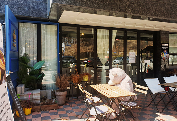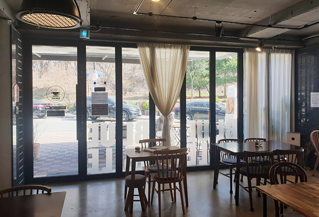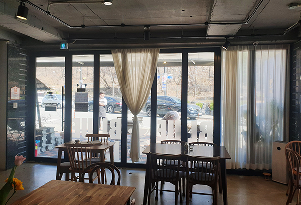 아기자기한 인테리어가 인상적인 브런치 카페입니다. 작지 않은 테라스를 보유하고 있는 상가로 마당같이 테라스를 사용할수 있는 곳 입니다. 그래서 넓은 야외 테라스로 테이블과 의자를 많이 두고 공간활용이 가능합니다. 날씨 좋은 날에는 저도 실내보다 야외 테라스쪽을 선택하여 자리 합니다. 많은 손님의 통행과 서비스를 제공하려면, 일반 통유리와 일반 문으로는 손님과 직원의 통행에 어려움이 있습니다.