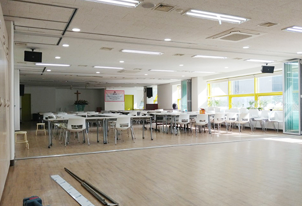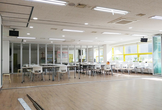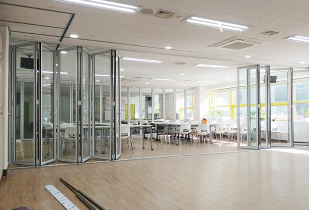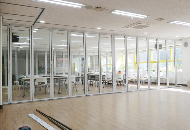 넓은 공간을 그냥 한공간으로만 사용하기엔 공간활용도가 높지 않습니다. 분리하여 사용하면 공간 활용도가 좋아지지만 그렇다고 가벽을 세우거나 불투명한 자바라를 이용하여 공간을 나누게 되면 불투명함으로 인해 답답함이 연출되며 더욱 좁은 공간으로 느껴질수 있습니다. 넓은 공간을 확장, 분리하여 공간 효율성을 높일수 있으며 투명 유리창으로 통해 넓어보이는 효과까지 볼수 있는 폴딩도어를 교회 생활관에 설치하였습니다.