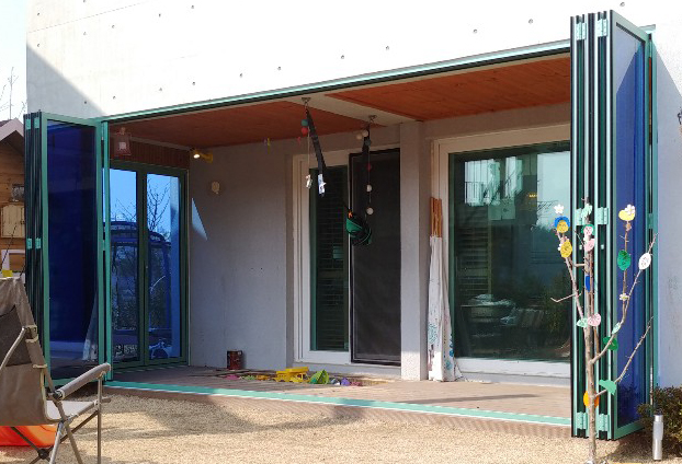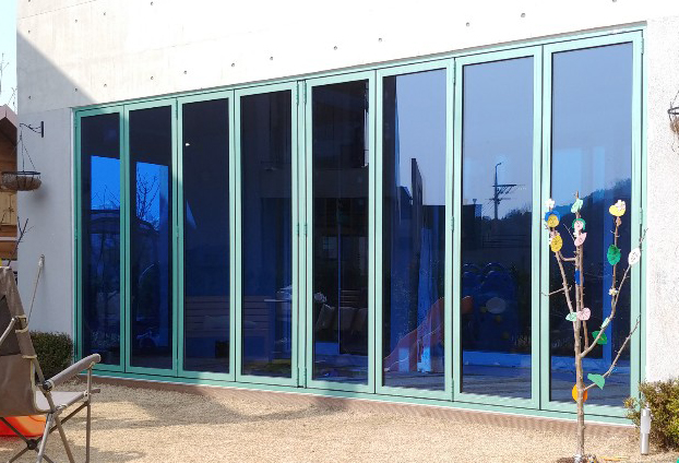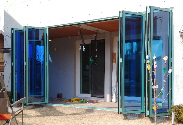 전원주택은 개인의 원하는 스타일로 구조부터 자재까지 만들어 나가는것이 때문에 일반 통 유리창보다 여닫이가 손쉽고 안전한 폴딩도어를 많이 선호 하십니다. 편리한 보조손잡이와 문 사이사이에 고무가스켓으로 마감하여 큰 힘 들이지 않고 여닫을수 있으며, 손끼임 사고로 인한 부상도 방지할수 있습니다.