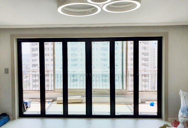 폴딩도어를 모두 열고 보니 걸림없이 보이는 외부 모습에 속까지 뻥 뚫리듯이 기분까지 상쾌해집니다. 이런 개방감으로 베란다를 개인적인 공간으로 꾸미시는 분들이 많습니다. 홈카페를 만들어 쉬는 날 편안하게 따뜻한 햇살 앞에서 여유를 즐길수 있습니다. 또한 넓은 개방감에 거실을 넓게 사용하고 필요한 만큼 폴딩도어를 열어 사용이 가능합니다. 총 6개의 문으로 양개형(2way)로 생활오염에 강한 블랙색상으로 시공하였습니다.