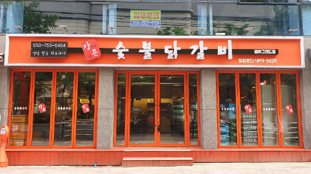 매장 간판색상과 같은 색상의 지정색상으로 폴딩도어와 힌지도어 2짝으로 출입문을 시공하였습니다. 양쪽 통 유리창 공간에 유리창을 제거하고 폴딩도어를 설치하였습니다. 숯불에 굽는 닭갈비로 환풍기가 설치되어 있지만 굽는동안 연기가 날수도 있고, 그 연기로 눈이 맵거나 손님들께 불편함을 줄수 있습니다. 또한 많은 손님들의 방문으로 연기가 자욱하거나 음식냄새가 가득할때는 폴딩도어를 열어 빠른 환기를 하여, 쾌적한 매장 실내를 유지 할수 있습니다.