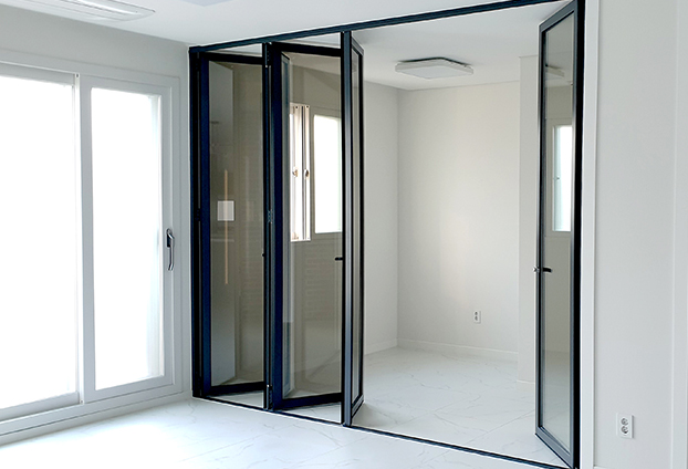슬림형 하부레일로 바닥에 매립을 할수 없는 경우에 진행되는 시공방법이며, 노출되는 높이가 낮으며 부드럽게 구동이 되어 가정집에서 사용하기 편리한 제품으로 시공하였습니다. 일반형 폴딩도어 하부레일과 달리 23mm로 설계되어 노출되는 부분을 최소로 줄여 통행에 불편함을 최대로 줄였습니다.