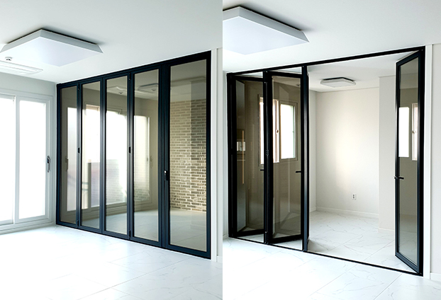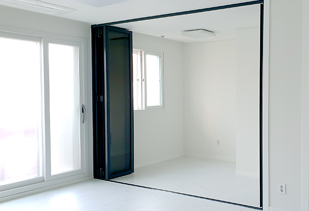 폴딩도어 너머로 보이는 모습 또한 색상으로 인해 너무 환하게 다 보이지 않기에 사생활보호도 가능합니다. 폴딩도어를 모두 개폐하면 더욱 확장된 공간으로 사용 가능하며, 또한 접어서 공간 분리도 자유자재로 가능합니다.